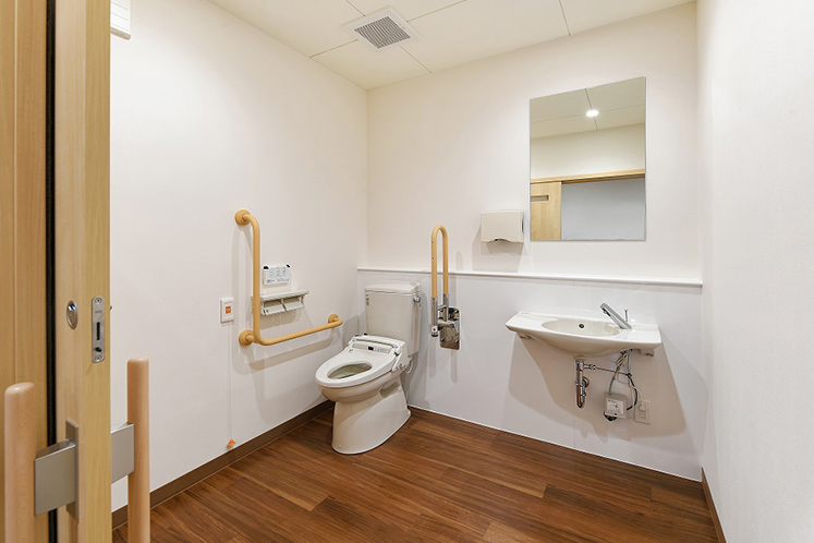 入所者様の楽しみの一つでもある入浴は、快適さと安全性を兼ね備えた仕様です。ご自身で入浴できる方はもちろん、入浴介助が必要な方でも安心して入浴を楽しんでいただけます。