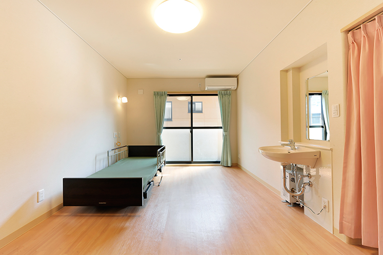 小規模特養いづみは、全室個室の29室。3階に「ひまわり」10室 2階には「こすもす」10室と「あじさい」9室の3ユニットで構成されています。ショートスティいづみは3階に10室あり1ユニットの構成、小規模多機能いづみは1階に9室の宿泊室があります。また、各部屋には、ベッド・トイレ・洗面台・エアコンを備え付けています。