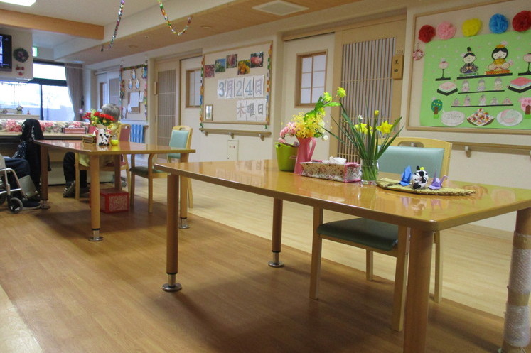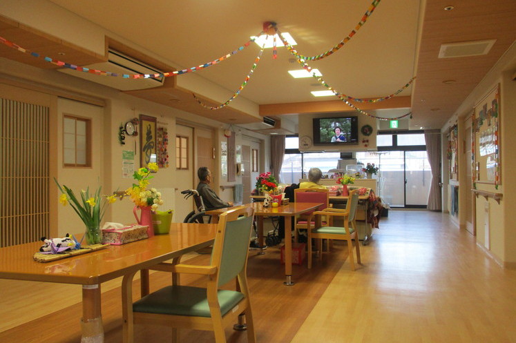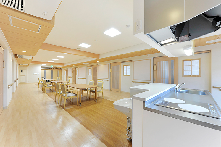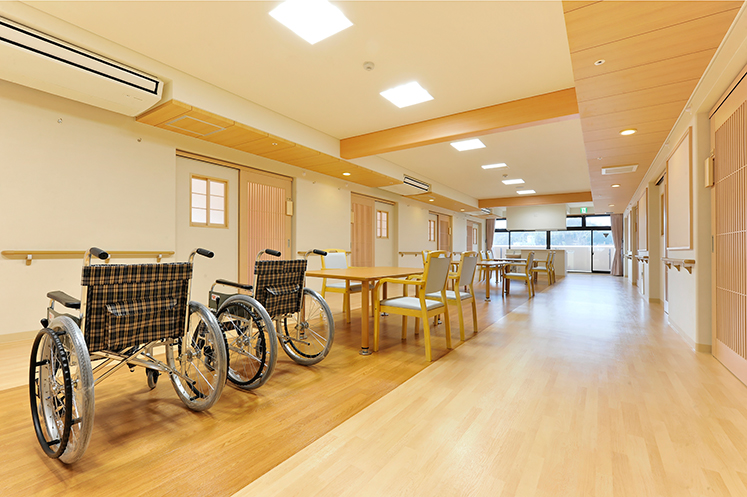 和モダンな扉を開けると すぐそこに広がる明るい木目調のリビングスペース。 壁のあちこちに 着物柄のタペストリーと「気」「心」「優」等の書があり落ち着いた和みの空間を演出しています。1階の集会所では、計画的に機能訓練にも取り組んでいます。 また集会所は地域の会合等にも気軽に利用していただけるスペースと なっております。
